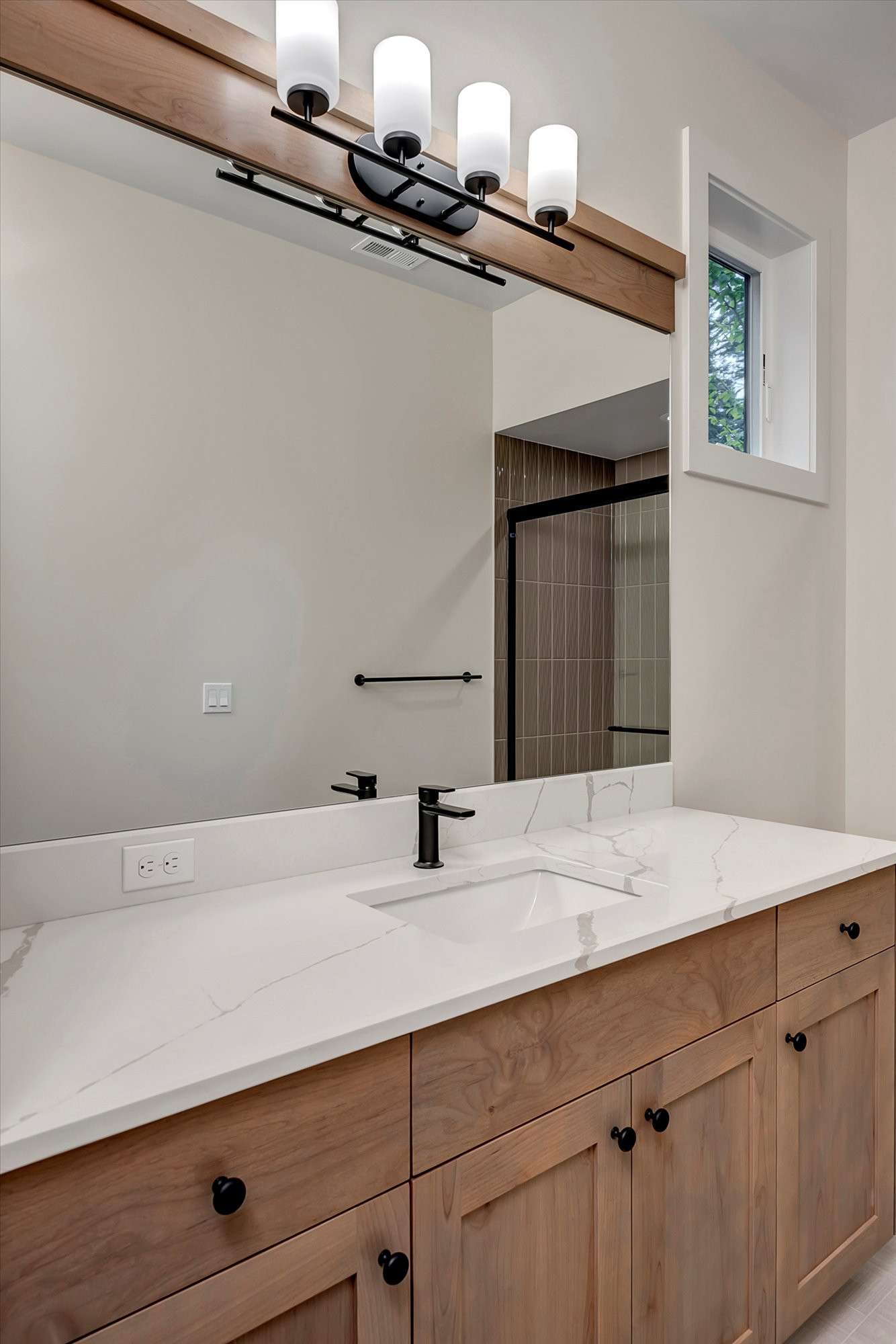 - Quartz slab countertop with under mounted sinks.