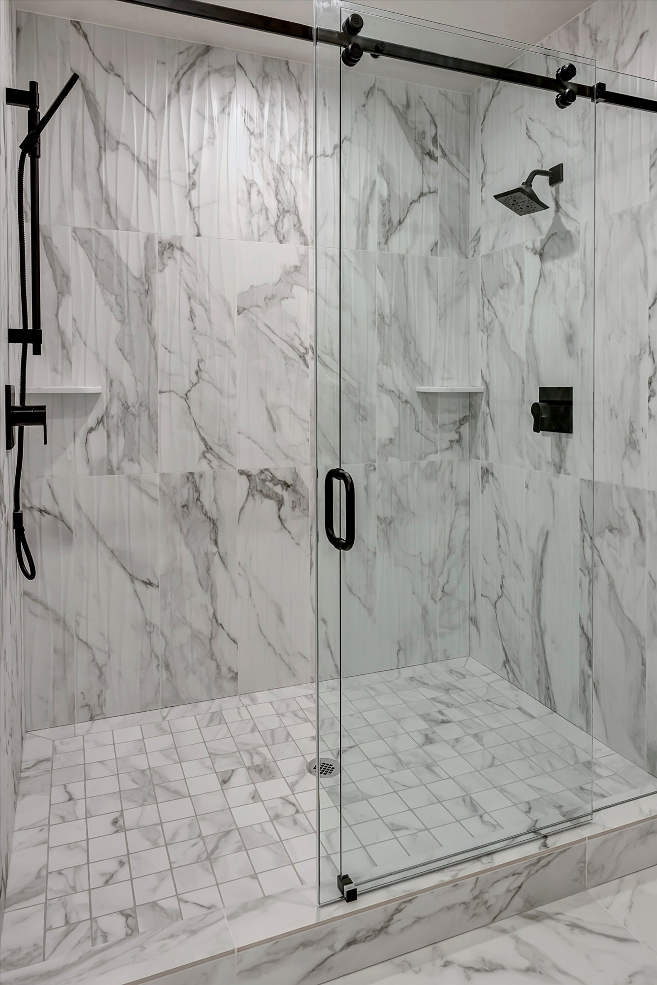 - Separate shower stall with tile floor, custom glass door and ceramic tile walls.