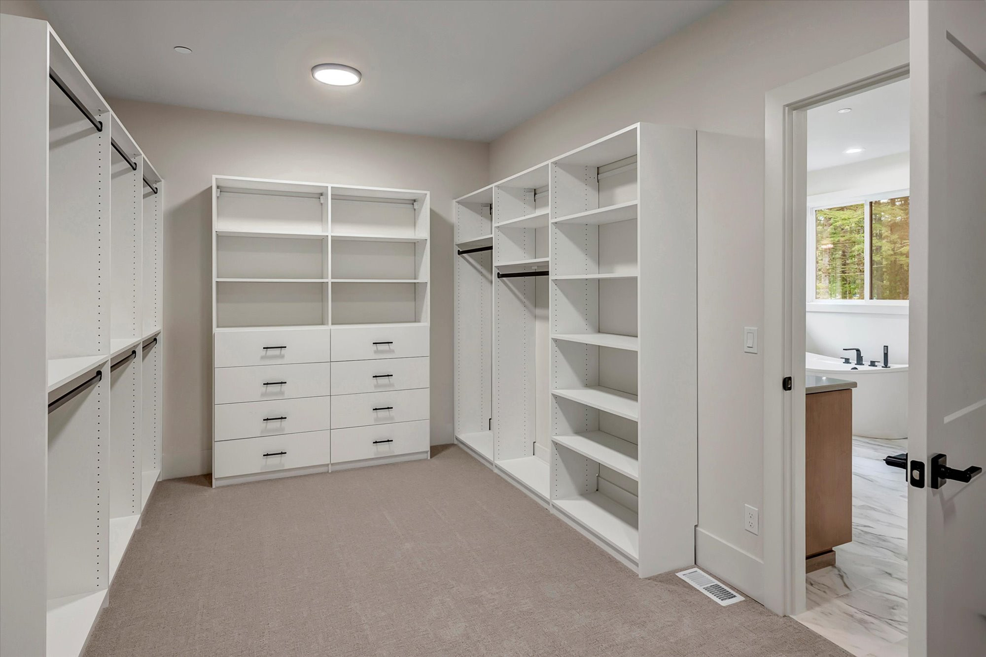 - Private bath/dressing area with double vanities and custom frameless cabinetry.
