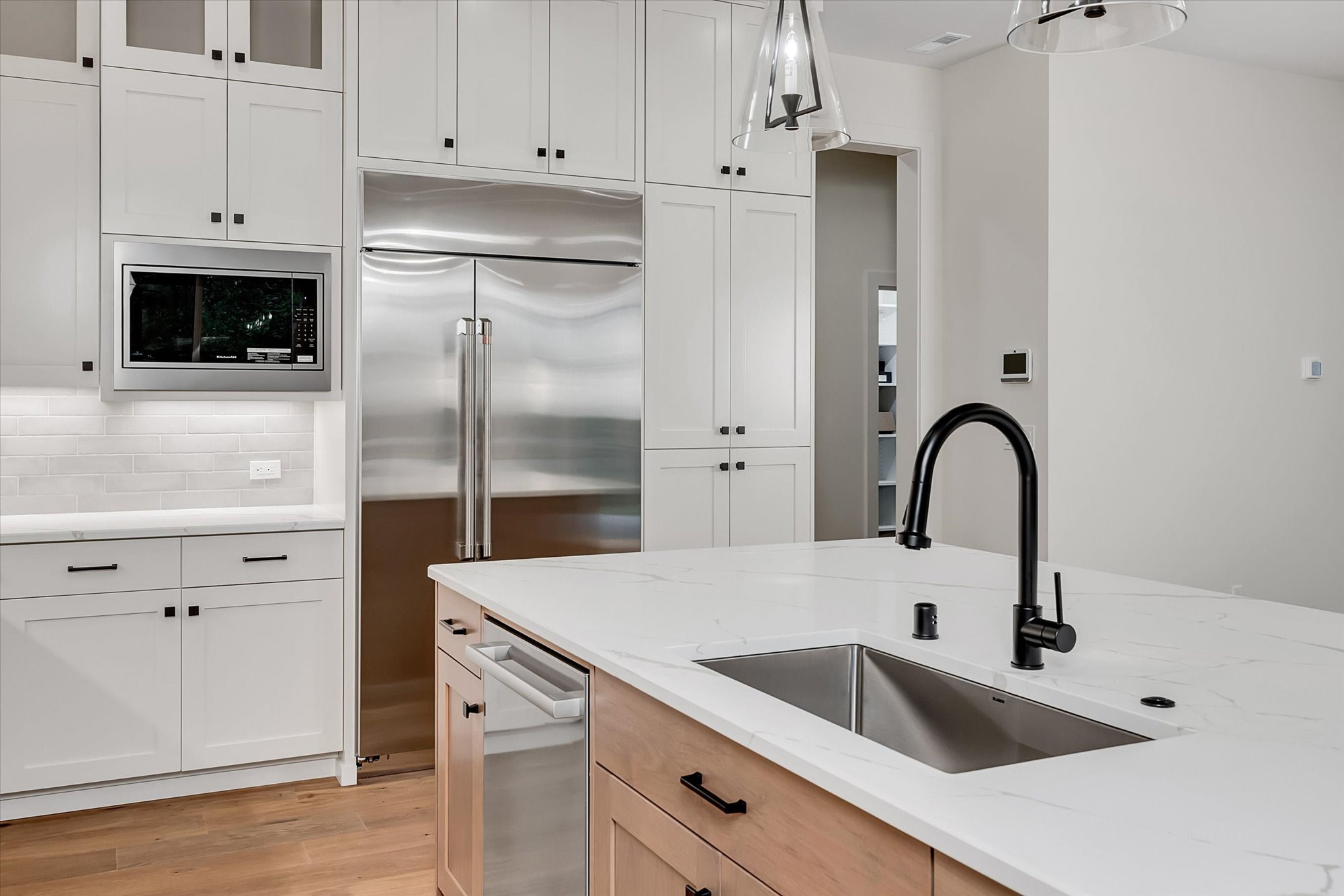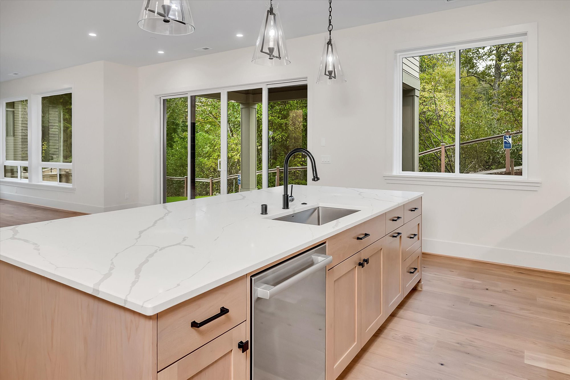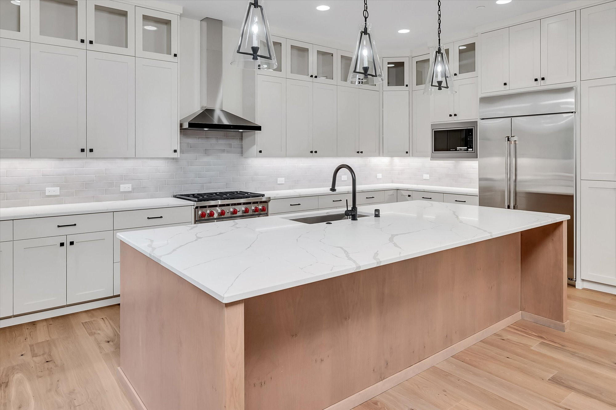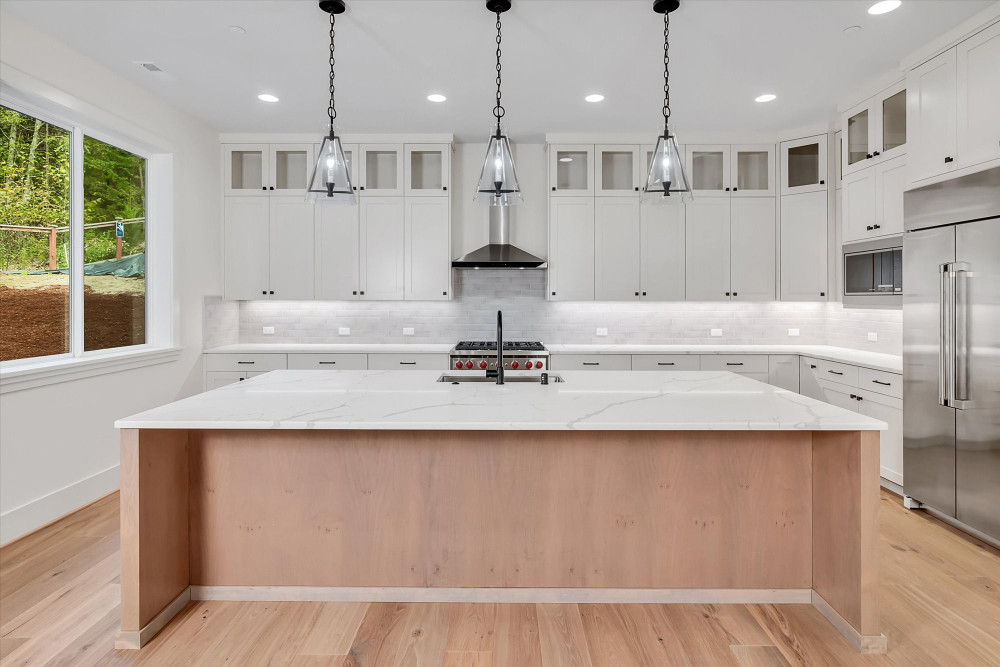 - Custom designed islands with breakfast bar seating and slab Quartz countertops.