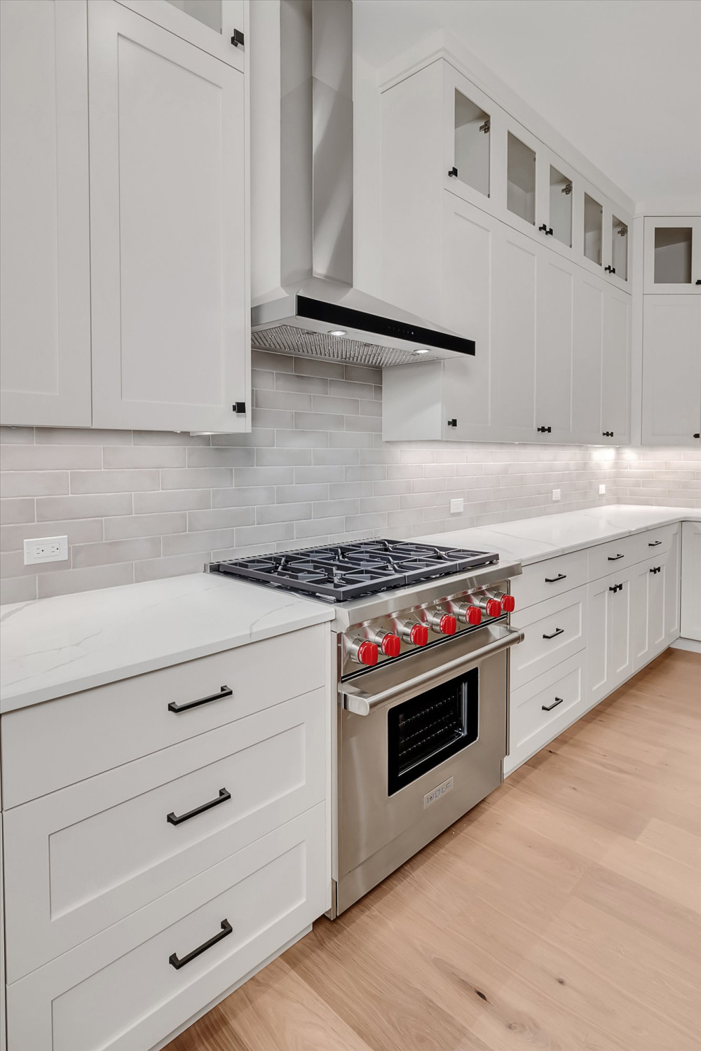 - Slab Quartz countertops include beveled self-edge and custom decorator tile backsplash.