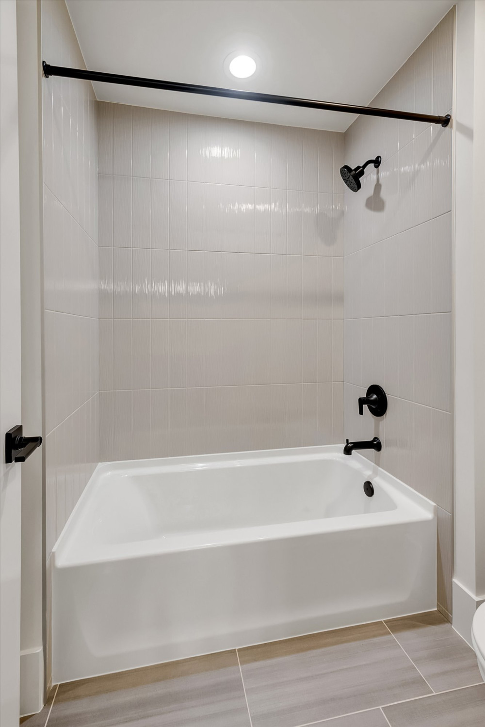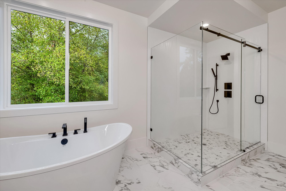 - Separate shower stall with tile floor, custom glass door and ceramic tile walls.